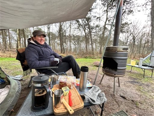 Slapen in een tent, koken op het kampvuur.